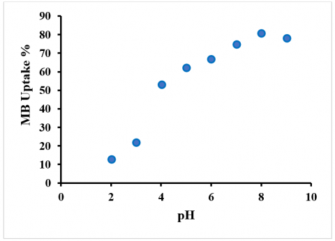 As shown in Figure 5, MB adsorption was low at acidic conditions (pH ≈ 2). With increasing pH, the adsorption capacity improved significantly, particularly between pH 4 and 7, and reached its maximum near pH 8. Beyond pH 7, no substantial increase in adsorption was observed. This behavior can be explained by the protonation state of the amine (–NH₂) groups on the modified adsorbent surface. At low pH, these groups are protonated to –NH₃⁺, which causes electrostatic repulsion with the cationic dye molecules, thereby reducing adsorption. At higher pH values, deprotonation occurs, reducing surface charge repulsion and favoring dye uptake.