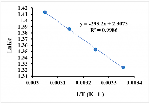 To better understand the adsorption mechanism, thermodynamic parameters including Gibbs free energy ΔG°, ΔH°, and ΔS° were calculated. The relationship between ln Kc and 1/T (K⁻¹) is presented in Figure 9, where the linear fit yielded the regression equation: