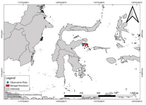 Figure 1. Research site (red mark) in Kokolomboi Biodiversity Park, Banggai Islands