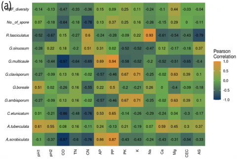 It is well established that the symbiosis, development, and diversity of AM fungi in an area are impacted by soil factors (soil pH and soil type), host plant species, and climate conditions [10, 14, 16]. The weak correlations observed for these four species suggest that their abundance and distribution are likely to be more closely tied to specific microclimate condition factors or unmeasured ecological factors.