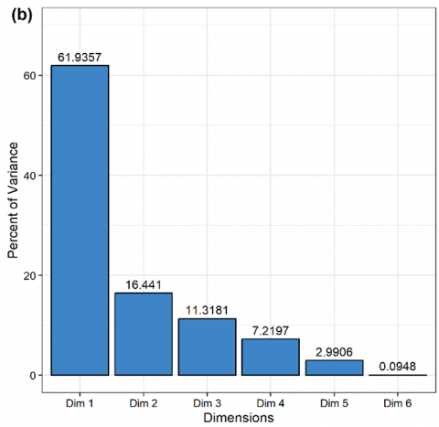 The squared cosine (cos2) value from the PCA shows that Glomus boreale (cos2 0.98 at Dim1) is the most important AM fungus in the observed community. Furthermore, A. tuberculata and G. sinuosum are AM fungal species with low cos2 values because they are only found in 1 plot with low abundance. The high cos2 value indicates that PCA well represents these AM fungal species [45, 46]. The eigenvalue shows that Dim1 in PCA can explain more than 50% of the variance in the analyzed data (Figure 7). Dim1 represents the elevation gradients except the elevation of 426 masl, which is well represented by Dim2. Based on Figure 7, a significant correlation is also seen between the plot at an elevation of 310 masl (A310) and the plot at an elevation of 801 masl (A801). Likewise, the plots at elevations of 523 and 702 masl. The abundance of AM fungi in each plot also influences the correlation between the plots. The directions and length of the arrows indicate the correlation and contribution of each variable to Dim1 and Dim2. In this study, we found that elevation of 310 masl is the most contributing variable for Dim1, followed by elevation of 801 masl and elevation of 611 masl, respectively.