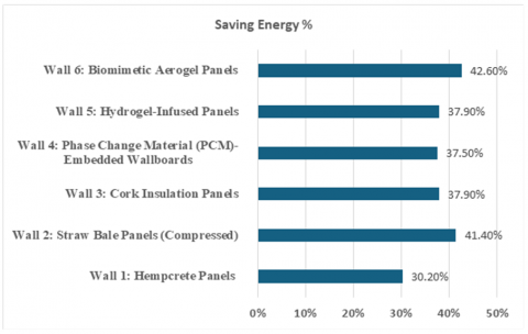 Cork and hydrogel panels showed similar intermediate results (6008 and 6006 kWh/month, ~37.9% savings), which give consistent results but are not the best in performance. PCM wallboards, which had latent heat storage storage were able to record only 6047 kWh/month (37.5% save) and became the fifth in general. The disjunction between the PCM melting temperature and the extreme summer environment of Mosul could have explained their low effectiveness, as they could not accommodate peak loads. Hempcrete did the worst of the options (6749 kWh/month, 30.2% saving) in keeping with its medium insulation and thermal inertia (Figure 12).