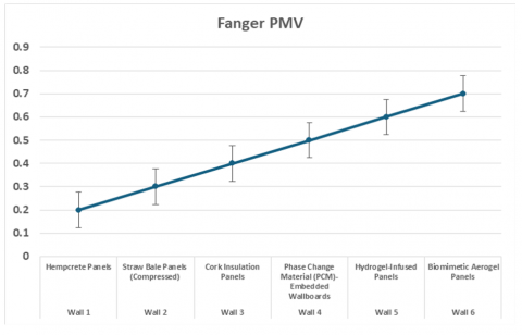 Regarding thermal comfort, Figure 14 explains that aerogel panels were the most advantageous, with the average values of PMV values near +0.7 during peak summer weather. This is a positive indication of a slight warm bias but a huge improvement compared to the base case (PMV ≈ +1.7). The next highest PMV result was the straw bale panels, which lost their structures to moderate the indoor environment by the combination of high thermal resistance and a combination of a high thermal mass. Cork and hydrogel were only slightly warm (PMV = +0.4 to +0.6), PCM (+0.5), and hempcrete (+0.2 -0.7) only improved this slightly, which again proves their unsuitability.