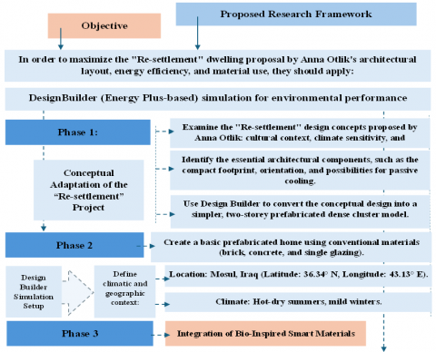 Since the aim of this study was to assess the performance of bio-inspired materials in a prefabricated residential building prototype based on the Re-Settlement project, the Mosul Housing Competition, by Anna Otlik, the study followed a simulation-based experimental approach. The strategy combines design modification, new material specification, and energy analysis to determine thermal comfort and cooling energy requirement in the hot-arid climatic conditions of Mosul, as indicated in Figure 5.