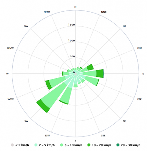 Although the prevailing wind directions (SW and SE) do not perfectly align with the primary facade orientation, they approach the building at oblique angles that enable diagonal cross-ventilation. According to studies [6, 20], cross-ventilation can remain effective when wind approaches at an angle of up to 45° to the plane of openings, provided that inlet and outlet paths are unobstructed and adequately dimensioned.