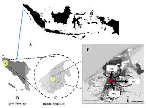 Figure 3. Study location map (A) Indonesia/Coordinates (0.7893° S, 113.9213° E), (B) Aceh/Coordinates (4.6951° N, 96.7494° E), (C) Banda Aceh/Coordinates (5.5483° N, 95.3238° E), and (D) The study areas are distributed across three administrative districts of Banda Aceh: Syiah Kuala (North Zone, WU: 5.5647° N, 95.3195° E), Ulee Kareng (Central Zone, WT: 5.5234° N, 95.3276° E), and Lueng Bata (South Zone, WS: 5.5301° N, 95.3199° E)
