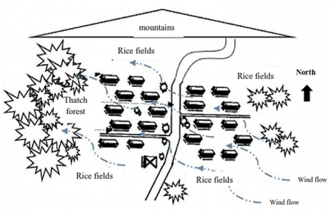 Figure 4. Landscape of traditional Acehnese villages in the interior and wind flow illustration [13]
