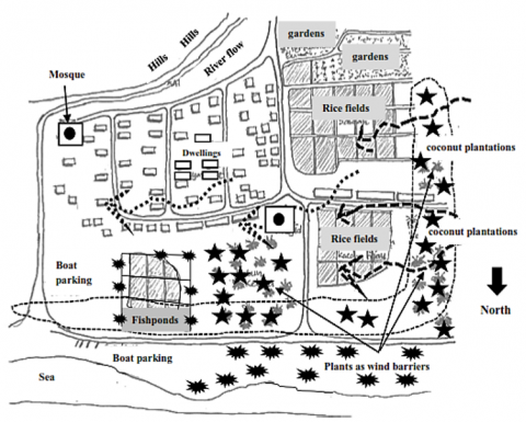 Figure 5. Landscape of traditional Acehnese villages in coastal areas and wind flow illustration