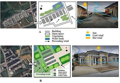 Figure 6. Plan view of housing landscape in the northern region and air flow illustration (A) P1WU and (B) P2WU