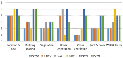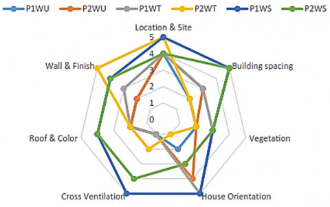 North-south orientation, as in P1WT and P1WS, minimizes exposure to direct solar radiation during the day. However, thermal performance is largely determined by the quality of cross-ventilation. P1WS exhibits a good cross-ventilation system, while P1WU, P2WU, and P1WT experience limitations categorized as "very poor," impacting indoor thermal comfort.