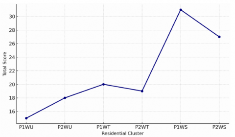 The compiled scores were tabulated (Table 1) and visualized using bar charts, radar charts, and line graphs to compare both cumulative and variable-specific performances among clusters. These visualizations facilitated the interpretation of quantitative differences and the identification of spatial patterns in climate-responsive design adaptation.