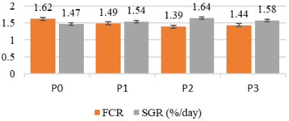 Figure 1. Specific growth rate (SGR) and feed conversion ratio (FCR) of Gourami (O. goramy) across the four dietary treatments (P0: 0% inclusion, P1: 10% inclusion, P2: 20% inclusion, P3: 30% inclusion of Alternanthera philoxeroides), with standard deviation (SD) represented as error bars