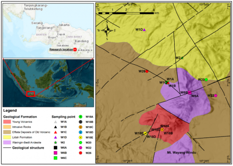 The sampling locations in this study were selected based on the proximity to geothermal outlets and accessible surface hydrothermal characteristics. This focused methodology attempted to identify regional variability resulting from geothermal discharges. Sixteen sampling sites were strategically positioned around the Wayang Windu geothermal region to encompass various geochemical zones.