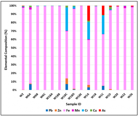 Precision was assessed through repeatability (same analyst, day, instrument), measured as coefficients of variance (CV, %RSD). The repeatability of As, Cr, Cu, Pb, Zn, Fe, and Mn was obtained at 9.47% RSD, 6.81% RSD, 6.42% RSD, 4.34% RSD, 3.12% RSD, 4.52% RSD, and 1.35% RSD, respectively. Accuracy was determined using recovery (% recovery) from spiked samples: 100.55% for As, 99.95% for Cu, 104.7% for Cr, 92.7% for Pb, 93.12% for Zn, 91.12% for Fe, and 93.48% for Mn, respectively. All of the elements were found to be within the acceptable range of 90-110%. Based on this, the method performed accurately and precisely.