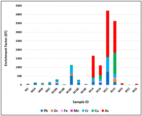where, Cr: the reference metal concentration, Bᵢ: heavy metal background concentration, and Br: the reference metal background concentration. The EF are categorized: EF ≤ 1: non-enrichment, 1 ≤ EF < 3: minor enrichment, 3 ≤ EF < 5: moderate enrichment, 5 ≤ EF < 10: moderately high, 10 ≤ EF < 25: high enrichment, EF > 25: very high enrichment.