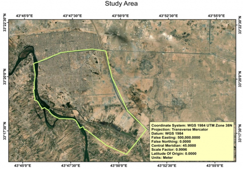 Figure 2 shows the boundaries of the study area, which lies within the geographical coordinates Latitude 33.337048°, Longitude 43.812410°. The area is estimated at about 45 square kilometres within the borders of the city of Fallujah, which is administratively affiliated with Anbar Governorate, and which is about 60 kilometres away from the capital city of Baghdad. The land is mostly flat (elevation from 41 to 55 m) and free of natural and man-made obstacles, except for the presence of a large industrial area that actually exists, which is land adjacent to the city of Fallujah.