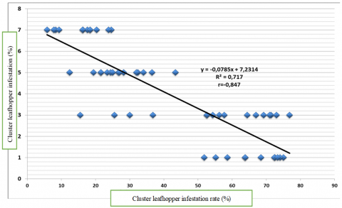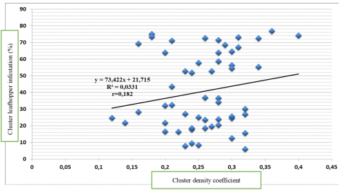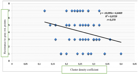 Research has confirmed a direct relationship between variable bunch density (bunch density coefficient) and the development of Lobesia botrana and Botrytis cinerea. Botrytis cinerea develops well on grape varieties with dense clusters, causing significant damage. There is a positive correlation between the cluster density coefficient and the degree of grapevine moth development (r = 0.182). The correlation between grapevine moth infestation and gray mold is negative and statistically significant (r = -0.847). This indicates that the pest Lobesia botrana stimulates the development of Botrytis cinerea.