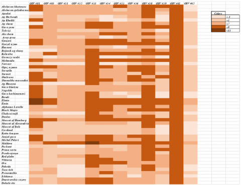 In cluster B, 8 grape varieties (Gyrmyzy Saabi, Novrast, Tuya Tish, Parkent, Pobeda, Ichkimar, Ag Huseyni, Chahrai taifi ) were concentrated in 2 subclusters, and both subclusters were divided into 2 sister clusters. The second sister cluster combined different genotypes (Tuya Tish, Parkent, Pobeda, Ichkimar, Ag Huseyni, Chahrai taifi). In cluster B, except for the Gyrmyzy Saabi variety, other varieties were the most resistant to the disease according to the OIV 451 and OIV 452 descriptors.