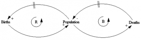 Figure 1. Cause-Loop Diagram (CLD) of a population model. R = Reinforcing loop, B = Balancing loop. Delays are marked by a perpendicular double strikethrough on the arrow