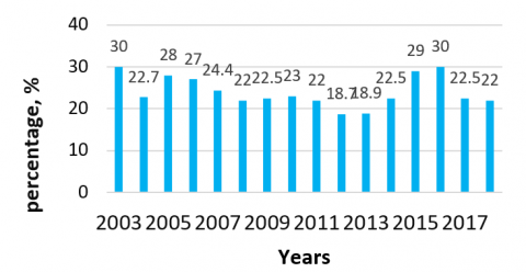 Undoubtedly, poverty is a multifaceted phenomenon with numerous causes, including economic, social, and political factors. A report by the Central Statistical Organization of Iraq revealed disparities in poverty rates between 2003 and 2018 [43], as shown in Figure 10.
