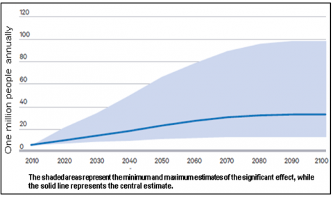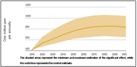 Increased respiratory diseases including bronchitis, pneumonia, and influenza due to airborne allergens. More than 400 million people are estimated to be exposed annually to heat stress levels that exceed the working heat limit (inability to work outdoors), and more than 10 million people are estimated to be exposed annually to heat stress levels that exceed the survival threshold (risk of death outdoors) [50], as shown in Figure 11.