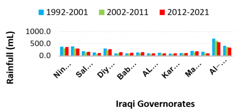 Figure 4. Average rainfall in Iraq during the periods (1992-2001), (2002-2011), and (2012-2021)
