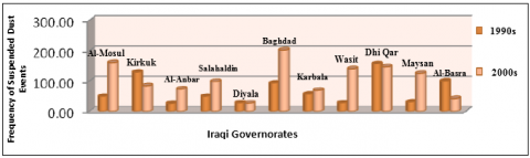 Figure 8 clearly illustrates a notable variation in the frequency of dust storm occurrences among the studied stations across the two periods. While some stations, such as Al-Basra, Maysan, Dhi Qar, Wasit, Salahaldin, and Kirkuk, recorded higher frequencies of dust storms during the 1970s, other stations including Baghdad, Karbala, Diyala, Al-Anbar, and Al-Mosul exhibited higher frequencies during the millennium.