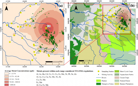 Heavy metals in the water within the study area include concentrations of aluminum, copper, iron, and lead that exceed the maximum permissible limits according to current local regulations [39]. Figure 5 shows the spatial distribution of heavy metal concentrations within the study area. These concentrations can be classified into five categories, with the highest concentrations being located in areas close to the mining activity (Figure 5a). The minimum average heavy metal concentrations detected were 6.2 ppb for different metals, and maximum concentrations of 1928.7 ppb in metals such as aluminum, copper, iron, and manganese. Both contrasts in heavy metal concentrations indicate contamination in accordance with the maximum permissible limits according to local regulations. This level of concentration compromises water quality, and in contrast to land use, it is possible to identify potentially affected areas downstream, mainly in shrimp farms, mangroves, banana plantations, and short-cycle crops (Figure 5b).