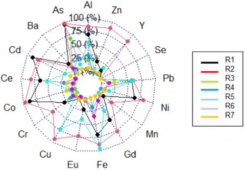 Heavy metal concentration measurements from March to June at the bioreactors reflect removal percentages higher than 50% depending on the efficiency of the bioreactors. For example, metals such as Al, Ce, Co, Fe, Gd, and Ni can be removed using R1 and R2. Figure 6 and Table 2 show the metal removal percentage for each bioreactor.