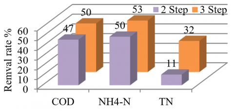 Two scenarios with different numbers of reaction steps were experimented with using similar operation conditions except for the time. The reaction phase in the first scenario consists of two steps 1/3 hr of Ax/Ox conditions, respectively while the second scenario consists of three steps1/3/3 hr of Ax/Ox/Ax conditions respectively. Each scenario was repeated three times and the average removal rate of pollutants was measured. Figure 3 depicts the removal rates of pollutants as an average of three cycles for the tested scenarios.