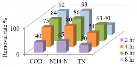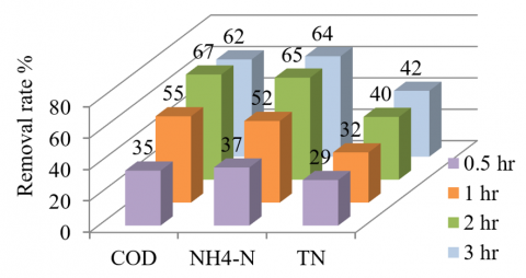 So, the enough time for this step is 1 hr. The overall percent of COD, NH4-N, and TN removal rates at 2nd anoxic time of 1 hr was 85, 87, and 64 % respectively as an average of three cycles.