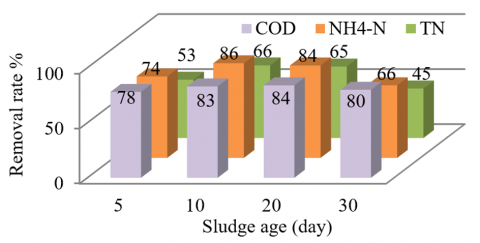 For TN removal rate, the optimum sludge age is 10 days which gave a maximum removal rate of 66%.