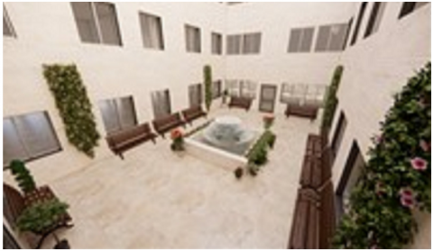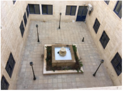 In contrast, observing the student behavior confirms that some areas on campus still lack shading structures, pergolas, and benches to encourage students and staff to come, sit, and talk; this harms the social sustainability of the place. The lack of benches leads the students to sit on the walls’ parapets or stand on the sidewalks; likewise, the lack of shading elements that protect the users from the direct sun in summer and the rain in winter leads them to sit inside the buildings. In some areas, the shading structure is fixed in the wrong direction and thus cannot protect the student from the direct sun during the day (Figure 8). Furthermore, the site observation shows that the buildings have central courtyards with water fountains at their center; however, many of these courtyards are not accessible for students and staff, and they are physically segregated, and the water features are seen only from the windows. Moreover, the courtyards are not planted or furnished, which negatively affects the design (Figure 9). Therefore, it is advised to redesign these courts by adding benches to encourage students and staff to come, sit, and communicate, planting some shrubs that are visually pleasant and environmentally friendly. The proposed design will increase urban cooling and enhance social sustainability; Figure 10 shows a proposed design for the courtyard that may enhance social and environmental sustainability.