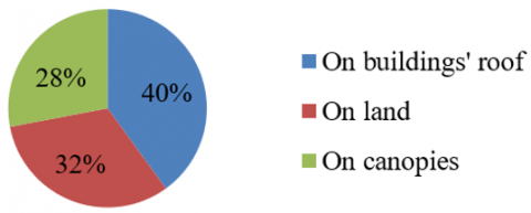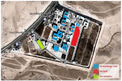 The data and numerical analysis confirm that the campus design maximizes the renewable energy potential by focusing on energy production to achieve the integrated scheme given by spatial planning. Renewable energy at Zarqa University, known as the Zarqa solar farm [29], can be considered a successful project for electric power generation where the generated energy reaches 2 MW. The project was established in 2016 on an area of 19 km2; it includes 7560 photovoltaic panels (250 watts of nominal power per panel). These panels are distributed on buildings' roofs, canopies, and vacant lands (Figure 11, Figure 12, and Figure 13). Analyzing the location of these panels confirms that their distribution and fixation angle were studied very well to benefit from the sun for the longest time during the day.