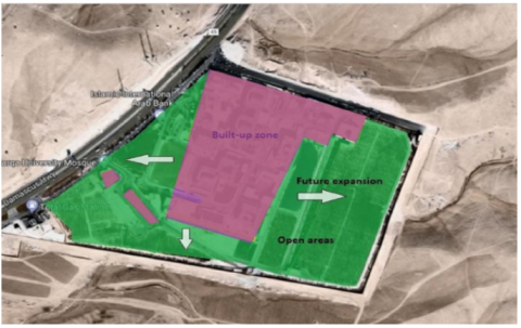 (1) Site analysis aims at comprehending the spatial organization of energy systems and gives valuable insight into how spatial planning could be integrated with energy planning. Zarqa University’s master plan has been assessed based on the critical spatial dimensions of energy planning implemented by planning professionals which are: Master planning and zoning, green infrastructure, and energy production to explore the pluses and minuses of the campus design. This includes the organization of the built environment, distribution of buildings, the form of outdoor spaces, and accessibility to the site.