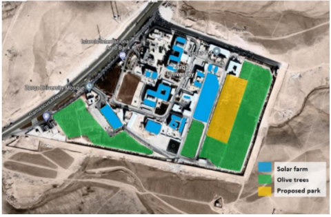 Analyzing the master plan of ZU campus confirms that it has a strategic opportunity for future expansion and development. The buildings are mainly located in the northwest corner and are surrounded by open areas that allow for the university’s future expansion (Figure 4). This open area is a valuable tool for fully integrating climate change adaptation and justification objectives into the site. Furthermore, Figure 5 shows that the spatial arrangement of the campus supports the energy integration within the landscape, as the central part is used as a solar farm; this farm consists of 8890 solar panels distributed on lands, buildings’ roofs, canopies; this farm produces about 660,597 Kwh per year as will be shown later in this research [27]. Moreover, the areas surrounding the buildings are planted with olive trees that have economic value besides their environmental benefits. Moreover, there are a lot of green spaces open to students and staff; these spaces are well designed and planted with suitable plants, which are known as the xeriscaping plants, as these florae do not need much water; however, these florae do not provide shades for sitting areas or walkways (Figure 6).