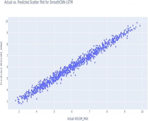 Figure 9 gives Actual vs. Predicted WS10M_MAX for Smooth CNN-LSTM, and Figure 10 denotes Actual vs. Predicted Scatter Plot for Smooth CNN-LSTM.