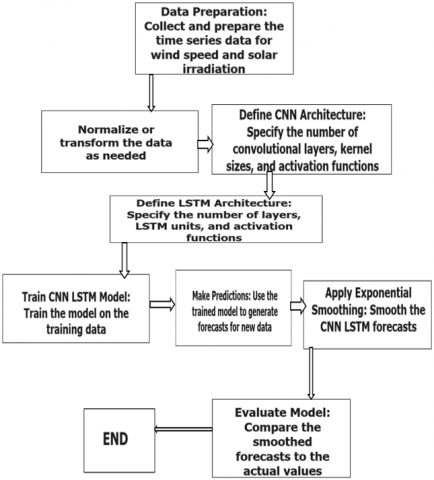 Figure 1. Flowchart for solar irradiation prediction and wind speed forecasting using smoothing CNN-LSTM model