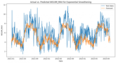 Figure 3. Actual vs. Predicted WS10M_MAX for exponential smoothening