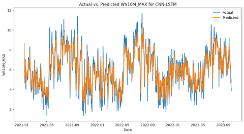Figure 7. Actual vs. Predicted WS10M_MAX for CNN-LSTM