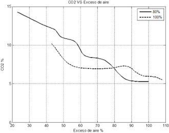 A range of flue gas temperatures was established between 170℃ to 200℃ for air excesses from 43% to 55% to obtain thermal efficiencies greater than 82%; this was achieved with 100% load; also, the CO2 concentration levels decreased from 12% to 8.5% at 80% load and from 10% to 7.5 at 100% load, while the CO concentration tends to zero with both loads.