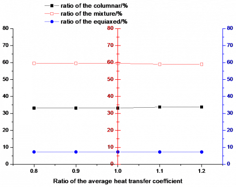 d) The average heat transfer coefficient ratios have little effect on the ratios of the columnar, equiaxed and mixture.