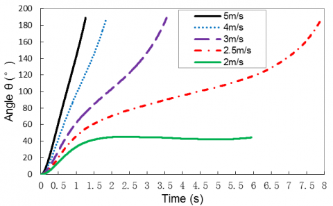 The angular displacement and angular velocity of the ball under different flow velocities are shown in Figures. 7 - 8. Figure. 7 shows that the ball could quickly reach the point at 180 ° as the flow velocity was greater than 3 m/s, and the ball retained a static balance at about 42 ° because of the zero velocity of the ball when the flow velocity was reduced to 2 m/s (as shown in Figure. 8).
