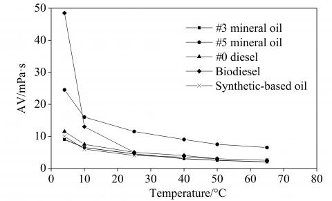 The base oil is the dispersing medium of any OBM. Its viscosity has a direct influence on the viscosity of the drilling fluid. Assume that other components of the OBM remain unchanged, the drilling fluid will have more stable rheological properties if the temperature-induced variation in base oil viscosity is insignificant. The author conducts an experiment on the viscosity variation of different base oils in a temperature range in a typical wellbore of deepwater drilling. (Figure 1) The results show clear viscosity increase of all the base oils with the falling temperature. Of course, the degree of increase differs among the base oils. The #3 mineral oil and synthetic-based oil have the lowest viscosities. The #0 diesel also has low viscosity. The viscosity of biodiesel is heavily impacted by temperature because of its content of the mixture of fatty acid methyl esters. The paraffin in biodiesel precipitates at a low temperature, resulting in poor flowability. This explains why the biodiesel viscosity decreases so rapidly with temperature increase. As for the #5 mineral oil, its viscosity obviously increases at a low temperature. In consideration of the toxicity, cost and the rheological properties at a low temperature, the author chooses the #3 mineral oil as the base oil for the flat-rheology oil-based drilling fluid.
