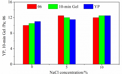 Different concentrations of NaCl, CaCl2, and drill cuttings are investigated experimentally to disclose their influence on the rheological properties of the FR-OBM at 4 ºC. As shown in Figure 8, the results indicate that the addition of NaCl causes the rheological parameters to rise slightly. As the NaCl concentration is increased from 0 to 10%, the yield point and 10-min gel of the FR-OBM remain at 10.5–12.5 Pa, and the θ6 reading remains at 10–12.5. Meanwhile, the FR-OBM maintains stable rheological properties in the presence of CaCl2, which is usually lower than 1%. As the concentration of CaCl2 is increased from 0 to 1%, the yield point and 10-min gel of the FR-OBM remain at 10–11.5 Pa, and the θ6 reading remains at 10–11.5. In addition, in the presence of 5–8% drill cuttings, the yield point and 10-min gel of the FR-OBM maintain at 10.5–13 Pa, and the θ6 reading maintains at 10–11.5. The results reflect the excellent contamination resistance of the FR-OBM. Therefore, the rheological properties of the FR-OBM will remain stable during drilling operations even if it is contaminated by NaCl, CaCl2, or drill cuttings.
