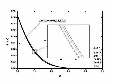 It is noteworthy to mention that by substituting $Da,Bi\to \infty $, f=0 and d1=d2=0 in Eqs. (10)-(15), the problem is reduced to the transient flow of regular fluid and heat transfer over an inclined stretching sheet which is discussed previously in [31].