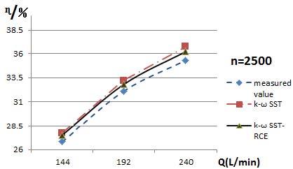 In Figures 6 and 7, the curves of the numerical results of the two models intersect each other. If the rotating speed remains at a low level, the numerical results of the k-ω SST—RCE are higher with a big flow, and lower with a small flow. Through comparison with the measured data, it is found that the calculated results of pump lift under different flow conditions all have errors of more than 10%, the biggest of which is up to 22.63%. The calculated results of efficiency under different flow conditions all have errors of more than 3%, the biggest of which is up to 11.29%. The errors are too large, and thus it is deemed that the results are not correct. In the causal analysis, in order to compare the calculation accuracy of different models, the same condition is set up for all working conditions – the flow field is steady on the interface between the rotating and stationary areas. However, when the pump rotates at a low speed, the rotating speed of the flow field in the pump decreases. The flow in the flow field is transient and pulsatile, and the flow on the interface between the rotating and stationary areas can no longer be regarded as steady and inhomogeneous, that is, it no longer satisfies the prerequisite for simulation with the MRF (Multiple reference frame) model, leading to large errors in the calculated results.