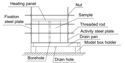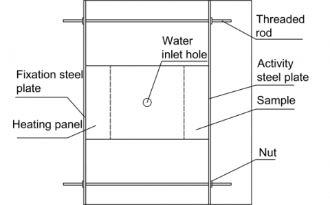 As shown in Figure 2, the customized testing device consists of a container, a thermostat-controlled heating panel and a water supply and drainage unit. The sample is placed in the container, and lateral restraints are provided to the sample by tightening the nuts of the moving steel plate. The heating panel is in series with a temperature controller, a thermocouple and a relay. It controls the temperature and maintains a constant temperature. The drying process goes as: 1) Place the heating panel on the top of the sample and put the thermocouple atop the sample to detect temperature. 2) Switch on the power and adjust the temperature controller to keep the temperature at 60°C; 3) Heat up the sample for 24h at 60°C; 4) Turn off the power and remove the heating panel.