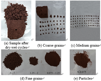 After the dry-wet cycles test, the samples are air-dried at room temperature. The sample fragments are then sieved by 8 sieves, which are 70, 50, 35, 15, 7, 2, 1.25 and 0.075mm, respectively, in diameter. The grains are divided into 4 categories: coarse grains ( $d \geq 15 m m$ ), medium grains ( $7 m m \leq d<15 m m$ ), fine grains ( $0.075 m m \leq d<7 m m$ ) and particles ( $d<0.075 \mathrm{mm}$ ). Figure 4 lists the particle size fraction before and after the sieving at 90°C. The measuring methods are described below: