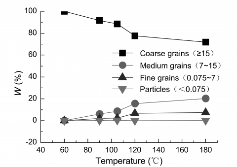 (3) With the changing heating temperature, the mass percentage of coarse, medium and fine grains varies regularly. Specifically, the mass percentage of coarse grains decreases but that of medium and fine grains increases as temperature rises. As for particles, which account for a small portion of mass, the mass percentage fluctuates with the temperature, showing unobvious regularity. The results show that higher temperature causes higher fragmentation and more medium and fine grains.